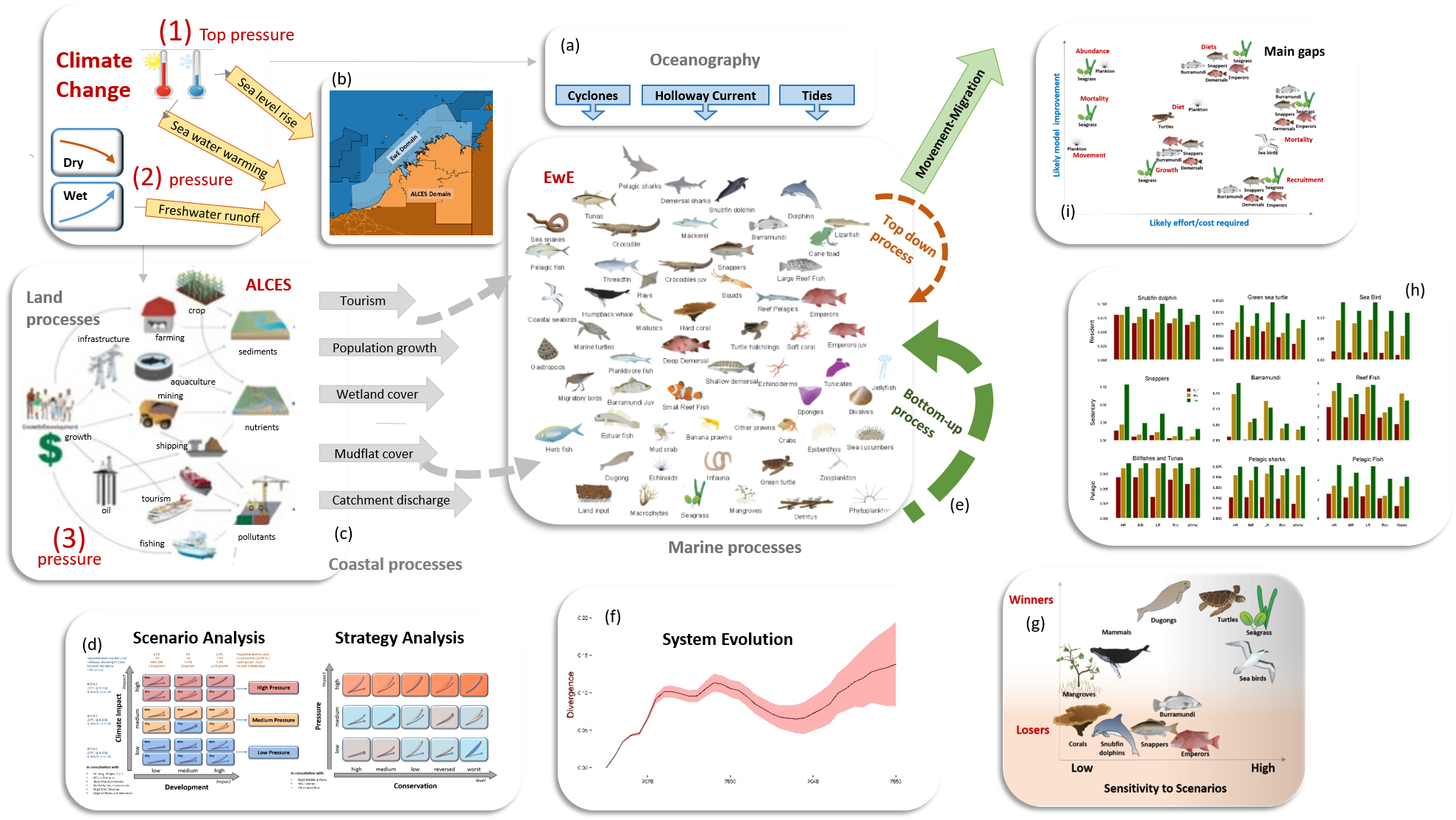 IntroductionIn this project we have explored the possible and desired futures of the Kimberly region. We have used two computer models, Ecopath with Ecosim and Alces. The futures we have explored have been determined in consultation with stakeholders and interested parties. This site describes the approach we have followed. We start by explaining why we use computer models and what it means to explore regional futures. We then provide some information about what models we have used and the geographical extent of the model domains. We proceed by describing the scenarios and management strategies we modelled. This site also includes all simulation results. Use the links on the left-hand side to cover all this material. You can also view our online Prezi presentation and an interactive visualisation of Ecopath with Ecosim foodweb. How does the Kimberley system work?Figure 1 below summarises this project by capturing its scope, what we learnt about the functioning of the overall Kimberley and the core results of this research. The marine ecosystem (EwE panel) receives pressure from both natural and anthropogenic land-based processes (ALCES panel) mediated by a number of coastal processes (panel c) which include tourism, population growth, changes in wetland and mudflat covers as well as catchment discharges in term of nutrient, sediments and pollutants.